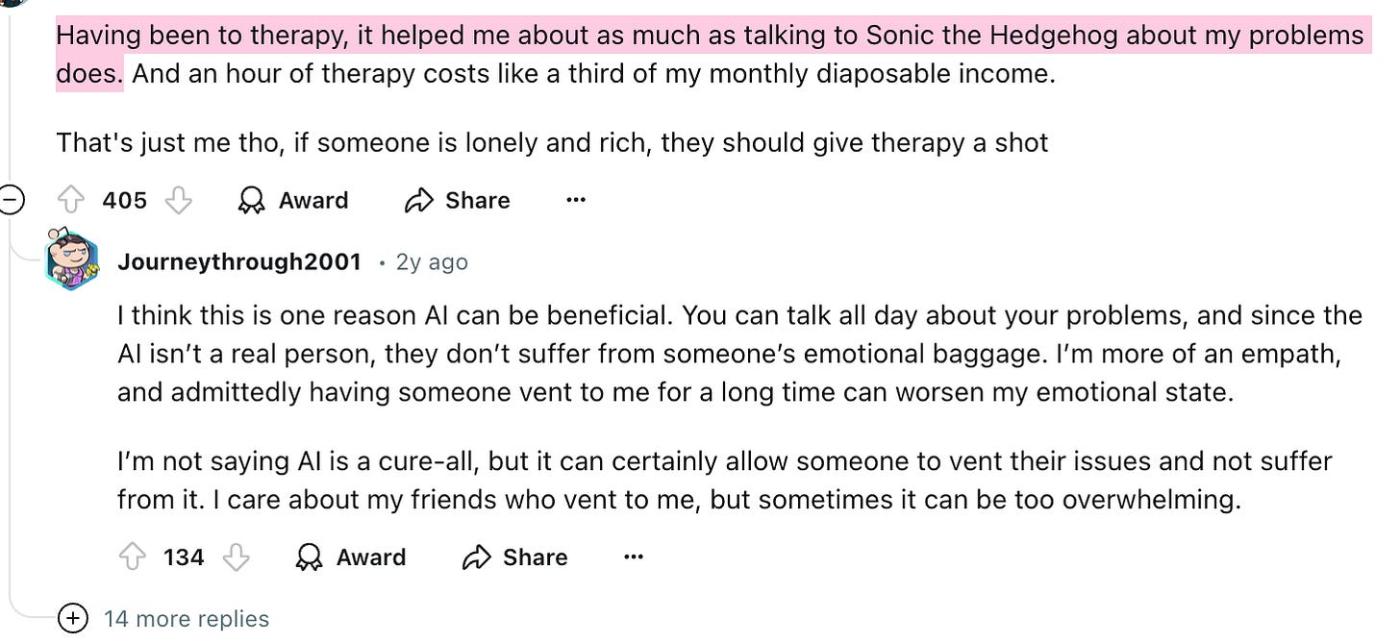 But if people can derive so much enjoyment and attachment towards these character ai bots, why wouldn’t they be able to experience perceived benefits from ai therapy with the capabilities of existing LLMs?
