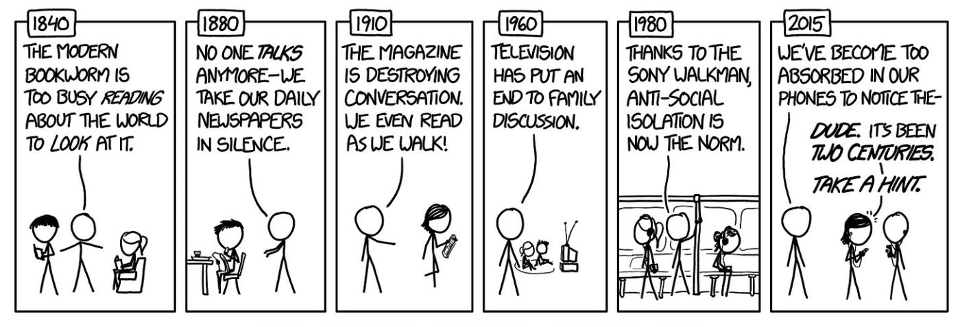 Magdalene J. Taylor wrote about a comic strip used in this defense, that “people love to cite detailing how every new form of media consumption throughout history has been blamed for the end of socialization.”
