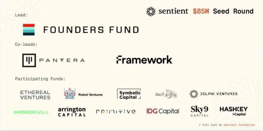 Strong financial support: Due to the huge potential of the track and the strong technical strength of the team, in July 2024, Sentient successfully completed a $85 million seed round of financing, co-led by Peter Thiel's Founders Fund, Pantera Capital and Framework Ventures, which was also the highest single financing amount in the AI+web3 infrastructure sector in the first half of 2024.