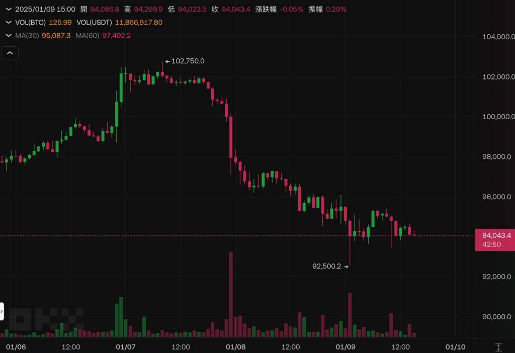 After returning above $100,000 on January 7th, Bitcoin has fallen from around $102,000 to a low of $92,500 on the 9th, against the backdrop of weakening expectations for the Federal Reserve to cut interest rates this year.