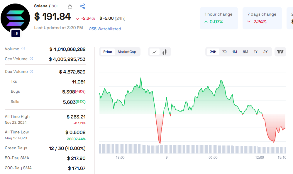 Current Solana Price Chart:Solana has been forming higher lows, a positive sign for its upward momentum. However, to truly establish strength, the Sol coin needs to reclaim the $222 mark, which would set a higher high and reinforce investor confidence.