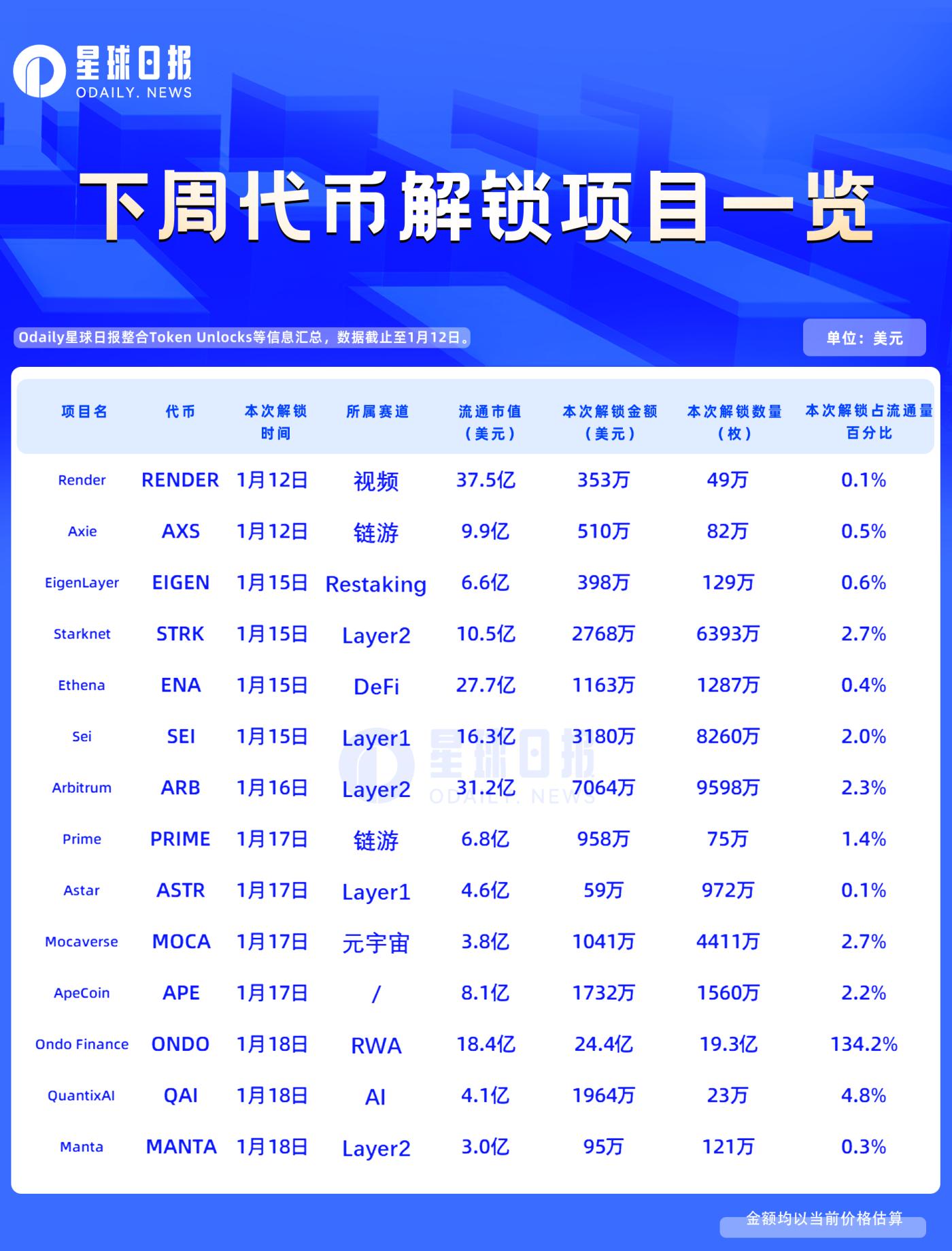 Next week, there will be 14 projects unlocking, and ONDO will see a huge unlock, with the token unlock volume exceeding 100% of the circulating supply.