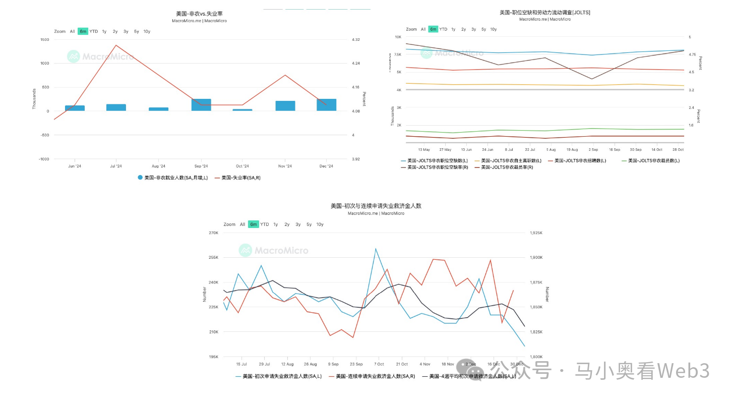 Next, let's look at the situation of the job market. We have selected four data for observation: non-farm payrolls, job openings, unemployment rate, and initial unemployment claims. First, non-farm payrolls increased from 212,000 last month to 256,000, far exceeding expectations. At the same time, the unemployment rate also fell from 4.2% to 4.1%. At the same time, JOLTS job vacancies also increased significantly, reaching 809,000. From the perspective of the more differentiated initial unemployment claims, it has also continued to decline, indicating that the outlook for the performance of the job market in January is also relatively optimistic. All of these show that the current US job market remains strong, and a soft landing should be a foregone conclusion.