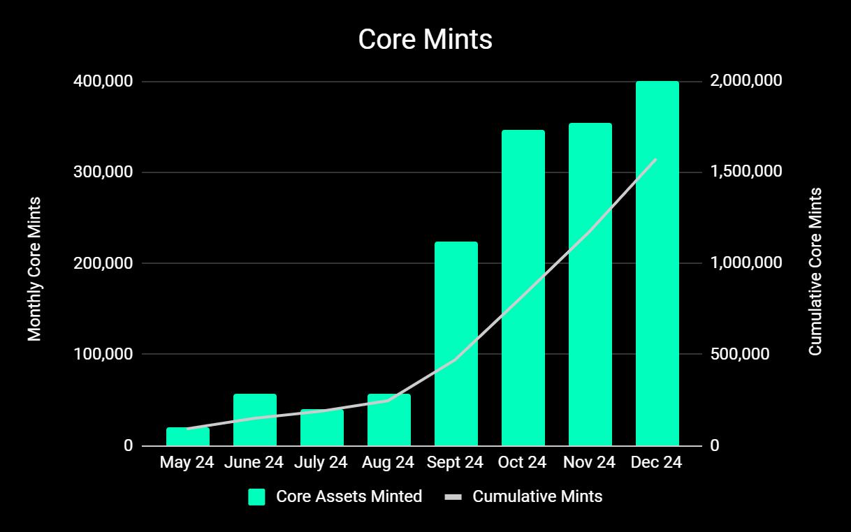 - Core Adoption: Nearly 1.6 million assets have been minted through Core, with over 400,000 minted in December, a new monthly high.