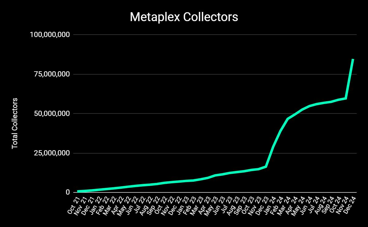 As of December, Metaplex has reached nearly 85 million unique wallets, adding over 25 million wallets per month.