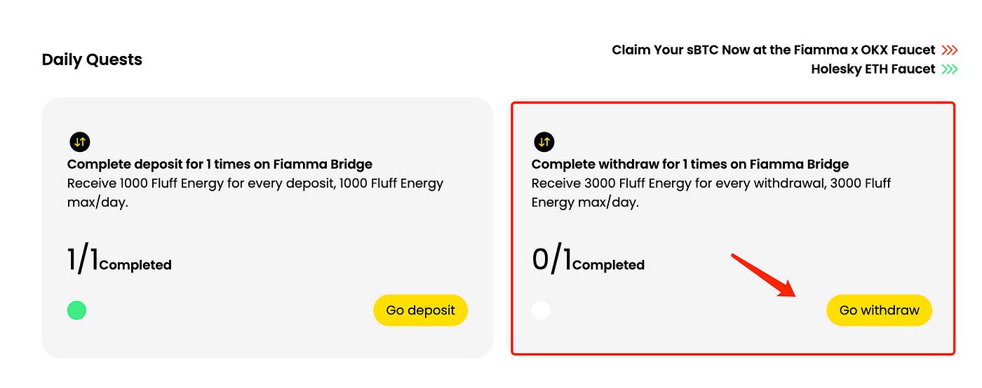 - Complete 1 withdrawal on the Fiamma Bridge (3000 Fluff Energy per day)