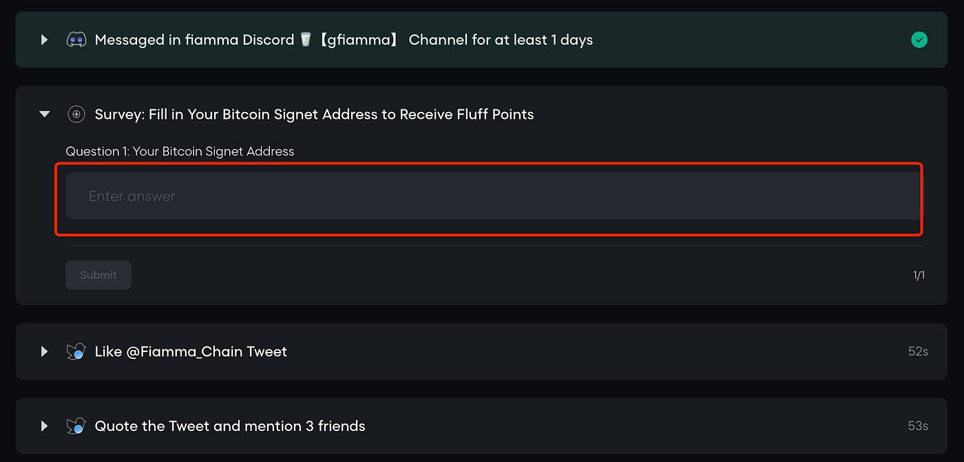 Fiamma updated new features yesterday, and the main task now is to collect points (Fluff Energy) and then unlock exclusive NFT fragments, and get the Mama Code NFT after collecting 6 fragments.