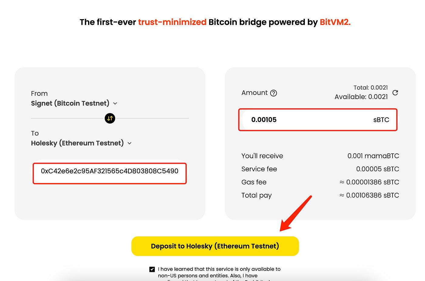 - Enter the amount (the deposit amount needs to be between 0.00105 and 0.01, so the BTC you've claimed may not be enough, try to upgrade in DC)