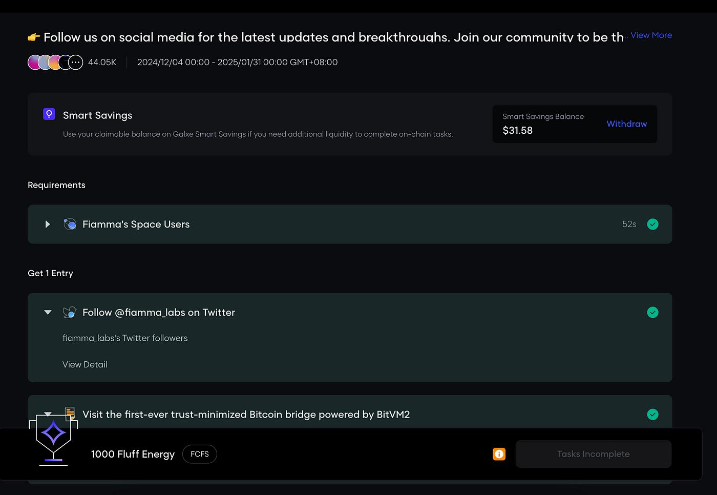 The Galxe event ends on January 31st. By completing all the tasks, you can get a commemorative badge and 1000 Fluff Energy;