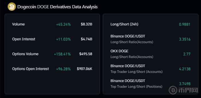 Dogecoin's on-chain activity also provides strong support for the market. According to data from CoinGlass, DOGE's open interest contracts have surged by nearly 10% in the past 24 hours, with the current total open interest value reaching $4.7 billion. This data reflects investors' positive expectations for Dogecoin's future price appreciation.