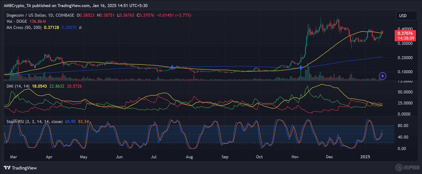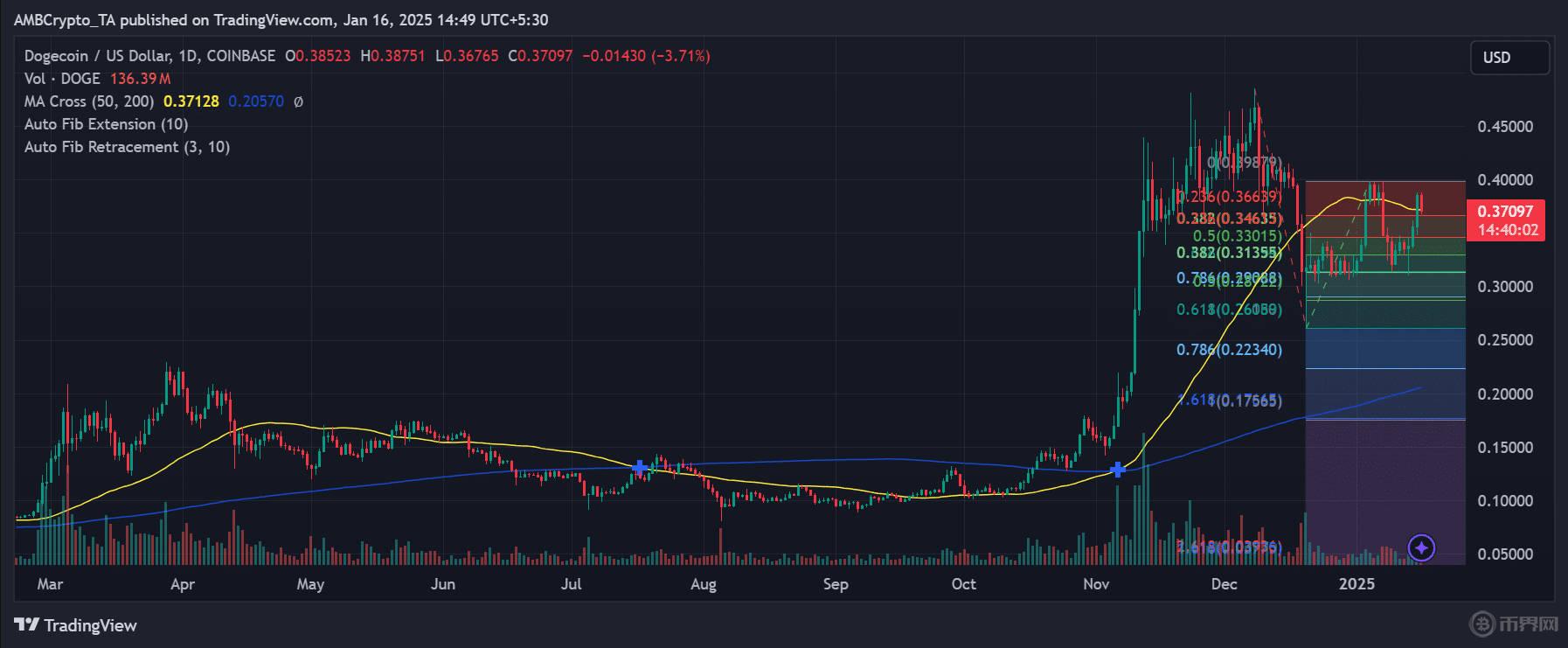Recently, the price rise of DOGE has attracted the attention of a large number of investors. Particularly in the price range of $0.09 to $0.37128, Dogecoin has faced strong technical resistance. According to the latest technical indicators, the 50-day moving average (MA) at $0.37128 is currently acting as a dynamic resistance level, while the 200-day moving average at $0.20570 provides long-term support for DOGE. Although the market has been in a volatile state recently, the overall uptrend remains strong.