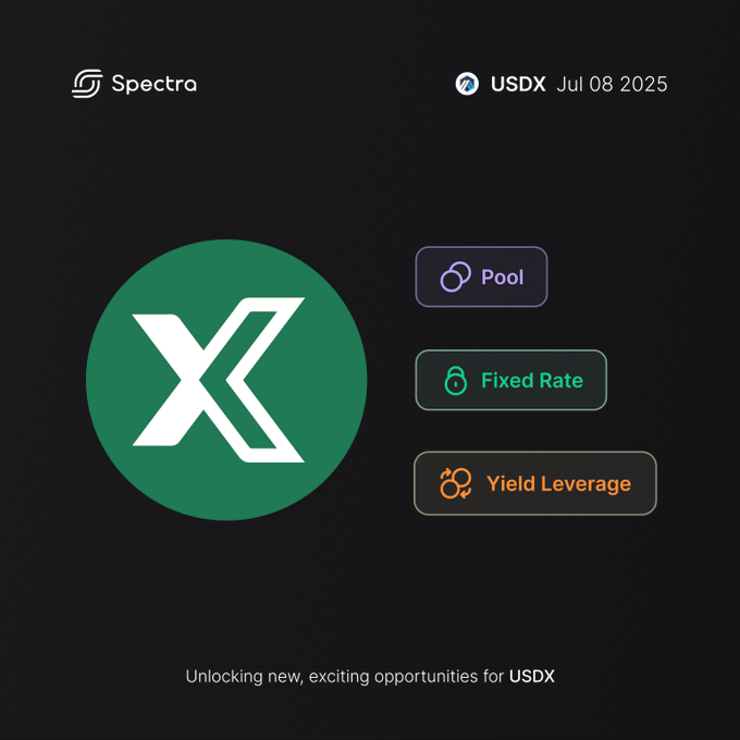 $sUSDX is now listed on @spectra_finance Split your $sUSDX into PT (Principal Token) and YT (Yield Token), Earn FIVE layers of yield: 🔹Pool's swap fees 🔹PT's fixed rate 🔹Native sUSDX yield 🔹SPECTRA incentives 🔹X-Points (starting next week) Don't miss out👇