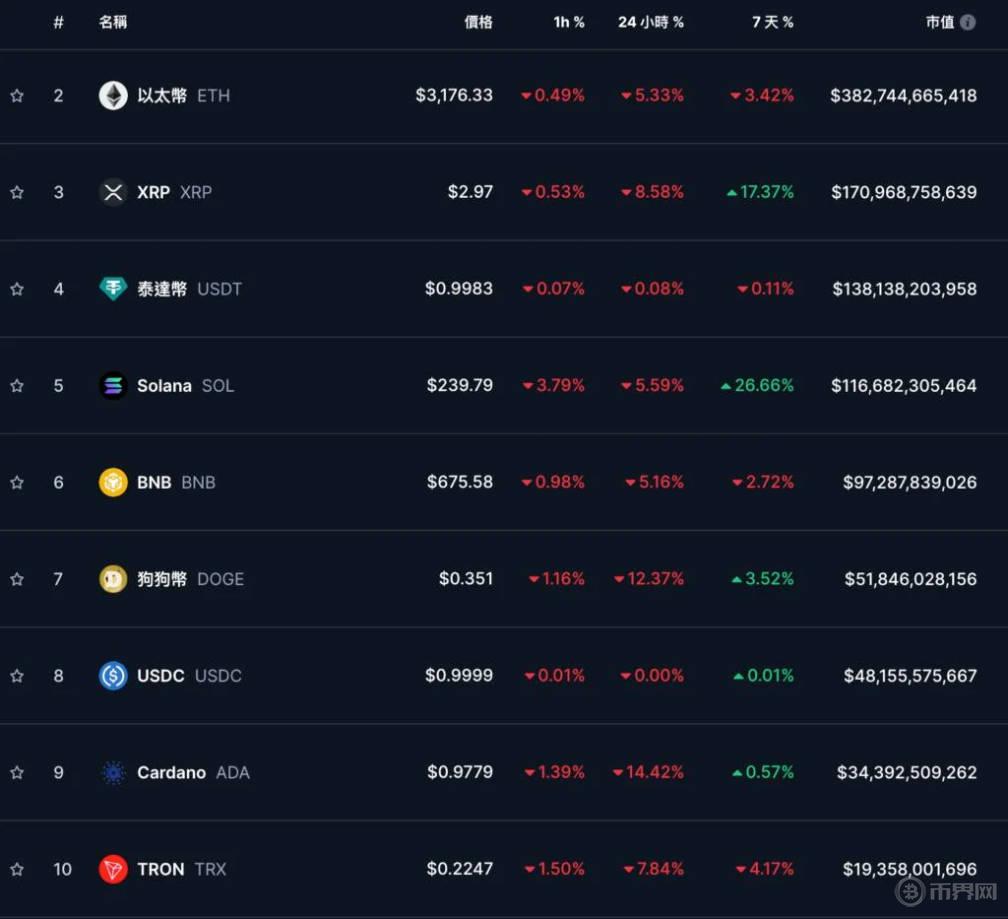 As the price of BTC plummeted, ETH was also not spared. After breaking $3,400, ETH experienced a significant correction, falling back below $3,200, losing about 80% of its previous gains in the past 24 hours. Similarly, Solana (SOL), which was affected by the Trump meme coin, also saw a significant correction, with the current price falling below $240, a drop of about 5.59% in 24 hours. These fluctuations not only impacted BTC and ETH, but also affected other mainstream cryptocurrencies.
