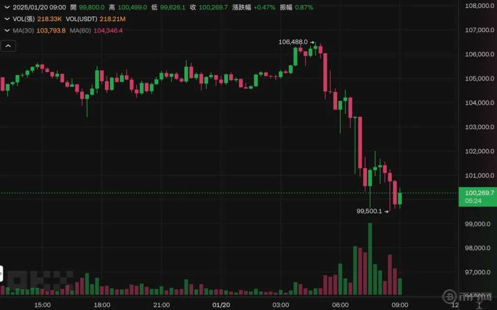 On the morning of January 20, 2025, BTC briefly broke through the psychological barrier of $106,000, setting a new recent high. However, within the following hours, the price quickly fell, reaching a low of $99,500, a drop of nearly $7,000 in just four hours. This violent fluctuation was likely driven by investors' risk-averse sentiment, especially against the backdrop of Trump's upcoming inauguration. The market generally expects Trump to mention cryptocurrencies in his inaugural address, and he may even issue an executive order supporting cryptocurrencies, which has increased investors' anxiety.