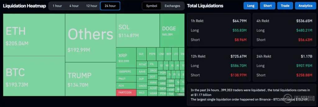 According to data from Coinglass, during the violent fluctuations in BTC, the entire cryptocurrency market saw over $1.17 billion in total liquidations, with long positions accounting for $907 million. These liquidations indicate that the instability and high volatility of the market have caused significant losses for many investors, especially when the market is overly optimistic or pessimistic, leading to large-scale fluctuations in the short term and increasing investment risks.