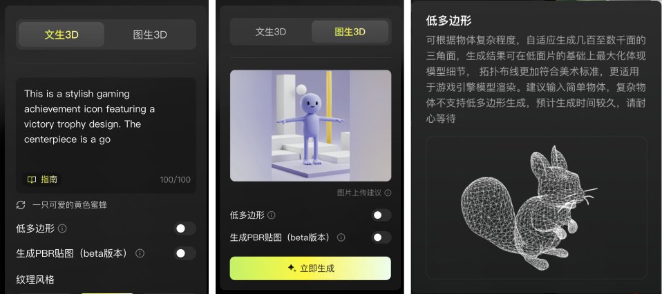 Figure and text are the most basic 3D generation functions, and the Hunyuan 3D creation engine also supports them, but the more powerful one is that it supports the direct generation of low-polygon and PBR textures.