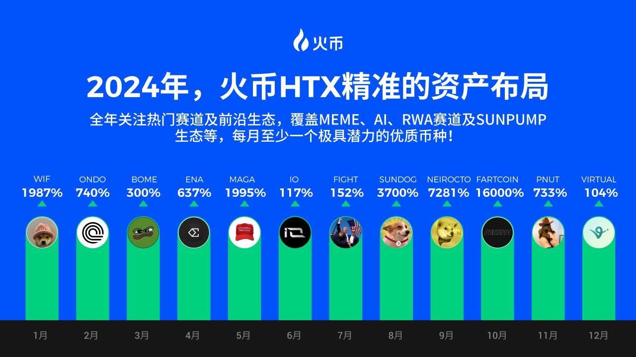 In addition, the Meme section assets launched by the Huobi HTX platform have also become an important channel for user wealth growth. In 2024, Huobi HTX, relying on its keen market insight and accurate asset layout, has continuously created considerable returns for users. Throughout the year, it has focused on hot tracks and frontier ecosystems, covering Meme, AI, RWA tracks, and the SunPump ecosystem, with high-quality currencies being launched every month, each achieving impressive growth: