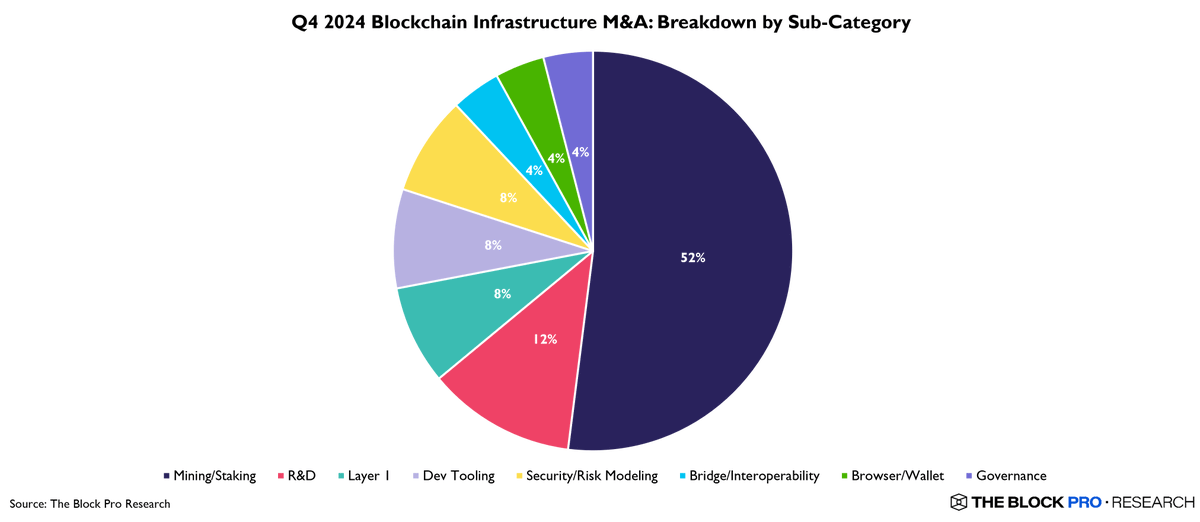 3/ Infrastructure led Q4 blockchain M&A with 25 deals, the highest on record. Cleanspark, http:/Crypto.com & Bitwise were key players in 2024, focusing on expansion and diversified services.