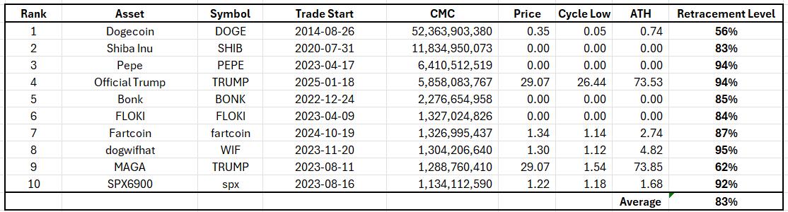 Similarly, the memecoin sector has taken a hit. The top 10 Memecoins tracked by Messari have also averaged an 83% retracement. As Blockworks pointed out, while the rotation from DOGE to SHIB signaled the peak in the last cycle, predicting this cycle’s peak is more challenging. Currently, at least 10 Memes are trading above $1B in market cap, and memecoins have been tracking the BTC rally but rotated rapidly among themselves.