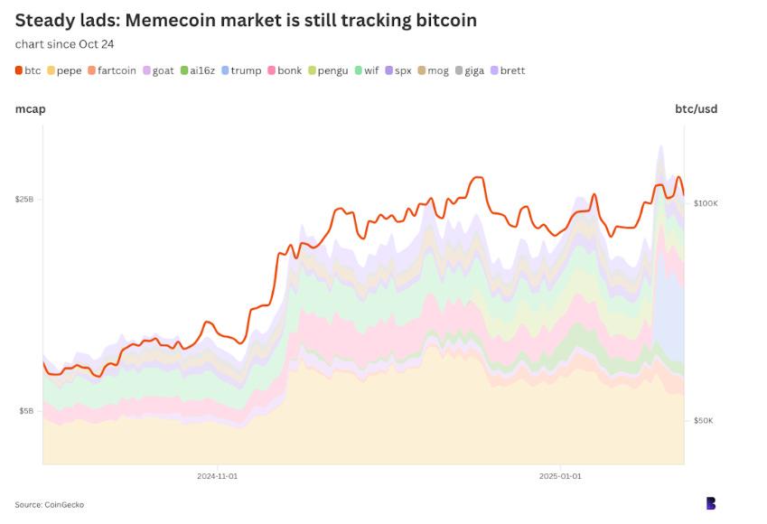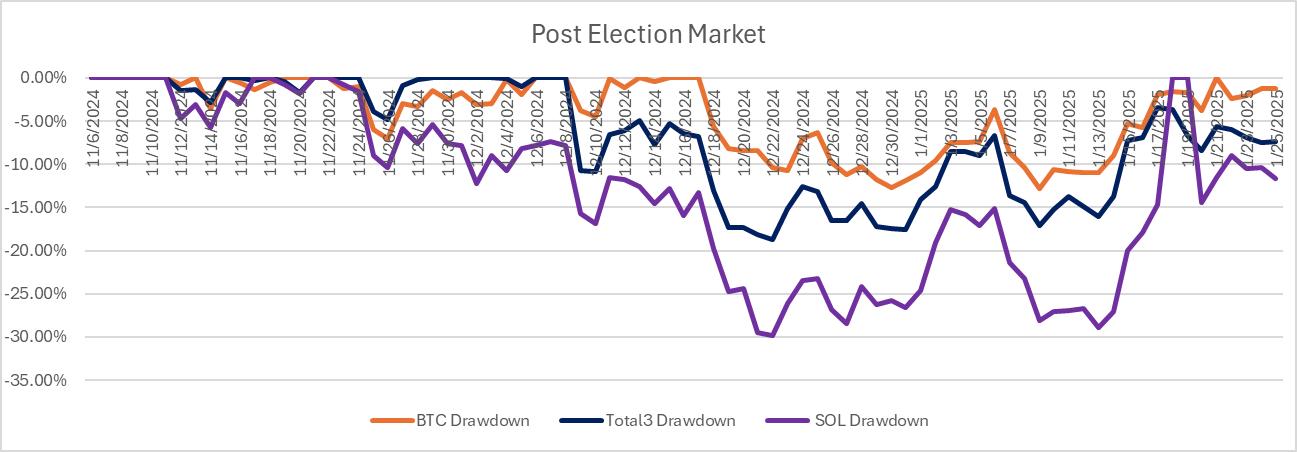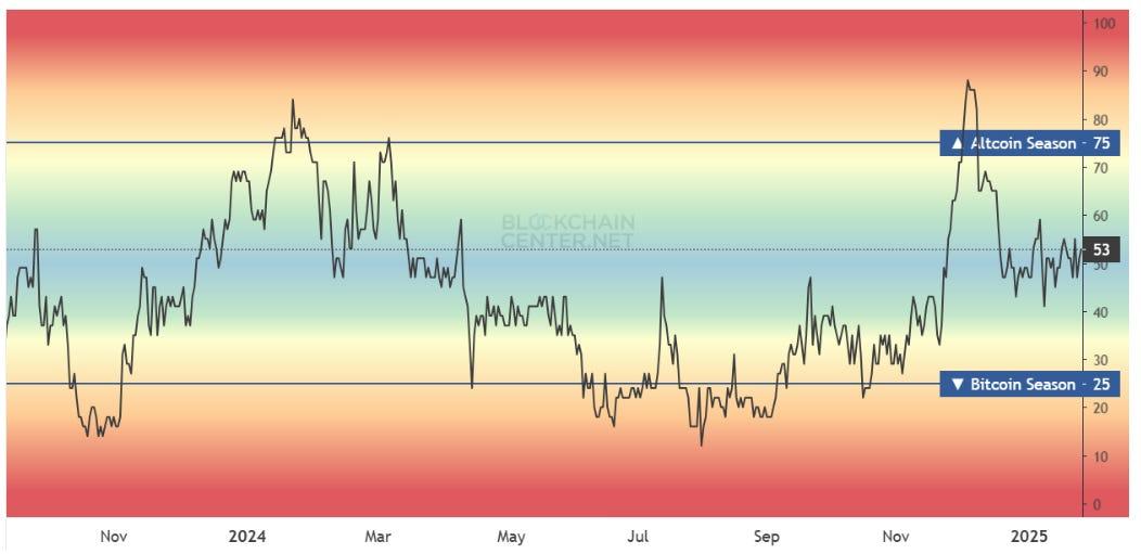 The market hasn't been particularly excited about the EO, as BTC struggled to return to last week’s ATH of $108K. Still, BTC has managed to stay above $100K for the longest streak since it first broke the critical level. Meanwhile, the Altseason Index has hovered around 50, indicating that the broader crypto market hasn’t matched BTC’s excitement.