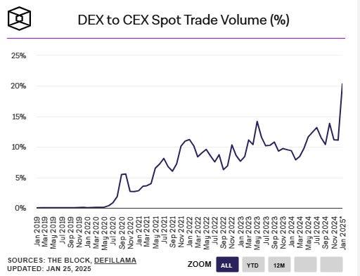 On the technology front, DEX trading volume has grown significantly, rising to 20% of CEX spot trading volume–double the level from just a year ago. Last week, we discussed the evolution of various AMM mechanisms, highlighting Jupiter’s advanced infrastructure of precise liquidity management. It’s no surprise that Jupiter recently announced its acquisition of a major stake of Moonshot, a popular mobile app often referred to as the “Robinhood for memecoin trading”. This move further expands Jupiter’s reach to mainstream retail traders. Jupiter itself also offers a mobile app, simplifying the trading experience for its DEX users.