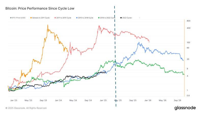 If past cycle patterns are any guide, this year has started more subdued compared to the 2021 bull market/ However, we could still be on track for a longer bull cycle resembling 2017. If the 2017 pattern holds–which coincides with Trump’s first term–we might see a peak by late April, aligning with the first 100 days of the new administration.