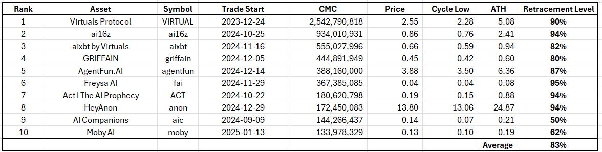 The much-coveted AI Agent sector hasn’t performed well either. According to Messari data, the top 10 AI Agent tokens tracked by Messari have retracted 83% on average from their ATH prices just one month ago.
