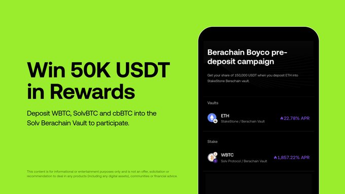 BTC HODLers rejoice—we're extending our Boyco Pre-Deposit Campaign to include you, with 50,000 USDT in rewards up for grabs! Deposit WBTC, SolvBTC.BBN, SolvBTC, or cbBTC into the Solv Berachain Vault to participate. 🗓️ Ends Feb 27 Start now: bit.ly/4gU1yXM