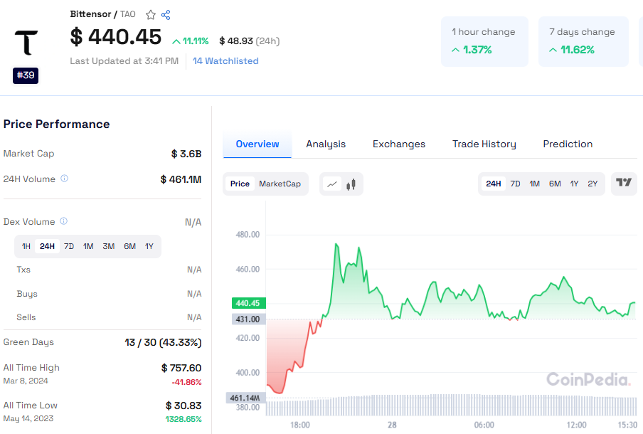 Bittensor (TAO) has shown remarkable resilience, currently trading at $434.9, marking a 24-hour increase of +0.44%. This performance comes after Monday’s market turbulence driven by NASDAQ losses and pre-FOMC anxiety, which impacted the crypto market.