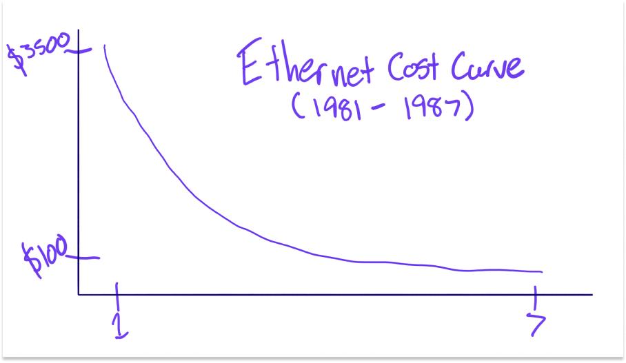 Krause gave an incredible interview on the company’s history on the Seeking Truth in Networking podcast. He said that in the beginning, the cost of Ethernet – the digital card (NIC), transceiver, and cable – was $3,500. He knew the company needed to get the cost down to $1,000, then to $100. They drew an exponential declining curve from $3,500 to $100 over 7 years, and realized that they’d just need to follow Moore’s Law’s 50% cost declines per year.