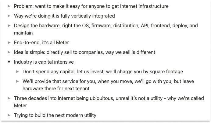 Meter’s investors include Sequoia Capital, Sam Altman, Scott Belsky, John Bicket, Sanjit Biswas, John and Patrick Collison, Egon Durban, Daniel Gross, Diane Greene, Sam Hinkie, Reid Hoffman, Sanjay Jha, Tobi Lutke, Jay Parikh, Geoff Ralston, Dan Schulman, David Solomon, Allen and Co, WndrCo., which is the kind of cap table you put together if you know what you’re doing.
