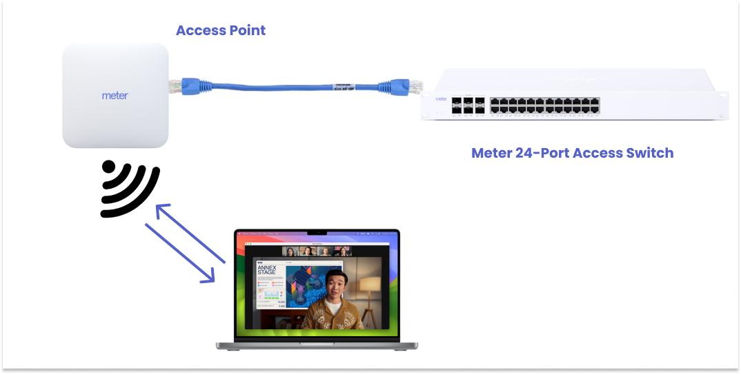The access point performs a crucial transformation: it receives these wireless radio signals, converts them back into digital data, and then sends that data to the switch – also provided by Meter – via Ethernet cable (with Power Over Ethernet, PoE, which powers and connects in the same cable).