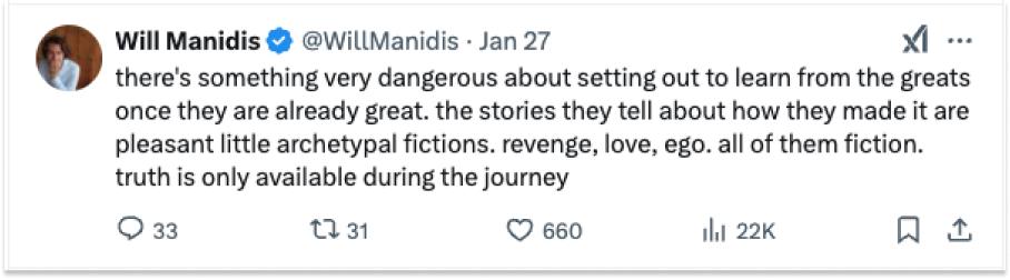 Within two minutes of meeting, he asked how I thought my writing had changed over Not Boring’s four years, then he asked if he could give me his opinion. I said of course.