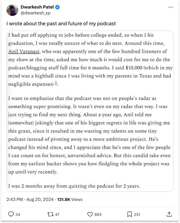 Dwarkesh Patel recently wrote about Anil asking how much it would take him to podcast and blog for six months, back when he was a relative unknown. He said $10,000, Anil gave it to him, he became a really great podcaster, and Anil told him (somewhat) jokingly that he regretted doing it, because it meant that Dwarkesh was wasting his talents podcasting.