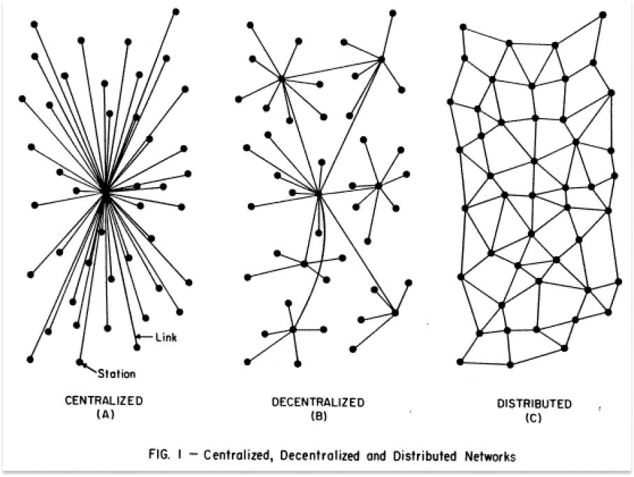 Baran proposed a distributed network with “packet switching,” in which messages would be broken down into small chunks (packets), each of which could take multiple different paths through nodes in the network to their destination.