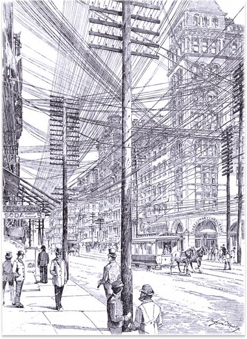 They’d call the electric company, who would send an engineer to assess the building’s location and suitability for electric installation. Assuming suitability, electrical engineers would design custom electrical plans for each building, which included the placement of wiring, fixtures, switches, and other electrical components. Then they would install wiring and appliances, like light bulbs and chandeliers. Once the building was wired, engineers would run wires from the nearest utility pole to the building, hence the blocked city sky.