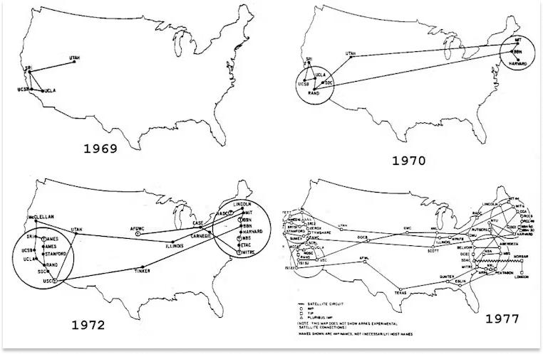 A few years later, in 1966, the Advanced Research Projects Agency (ARPA) set out to create a network of computers as robust and fault-tolerant as Baran’s telephone network design. They built ARPANET, which went live in 1969 with four nodes, and grew node-by-node, mainly university-by-university, over the next decade.