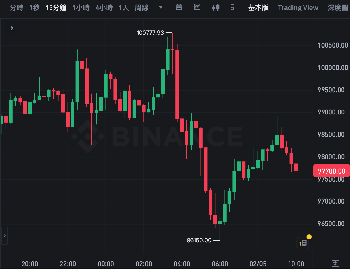 However, against the backdrop of heightened market uncertainty, the strength of gold contrasts sharply with the volatility of BTC. Binance data shows that the BTC price, after reaching $100,700 around 3:30 am this morning, has retreated, and this morning around 6 am it risked falling below $96,000. As of the time of writing, BTC has rebounded to $97,700, down 3.42% in the past 24 hours.