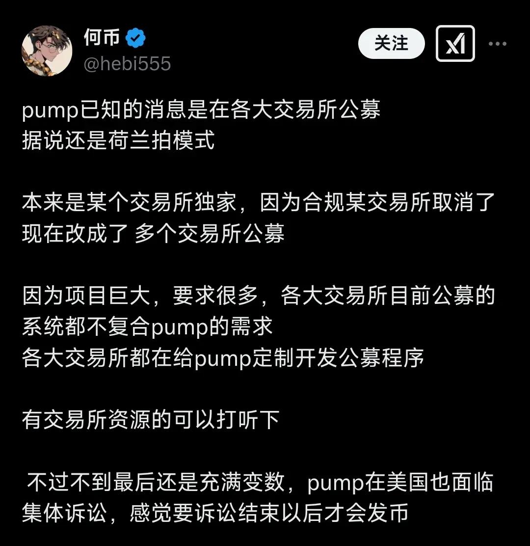 According to ChainCatcher's message, the well-known crypto KOL He Bi (@hebi555) posted a disclosure on X: "The known information about pump.fun is that it will be publicly offered on major exchanges, and it is said to be a Dutch auction model. It was originally exclusive to a certain exchange, but due to compliance issues, that exchange has canceled it, and now it has been changed to a public offering on multiple exchanges.