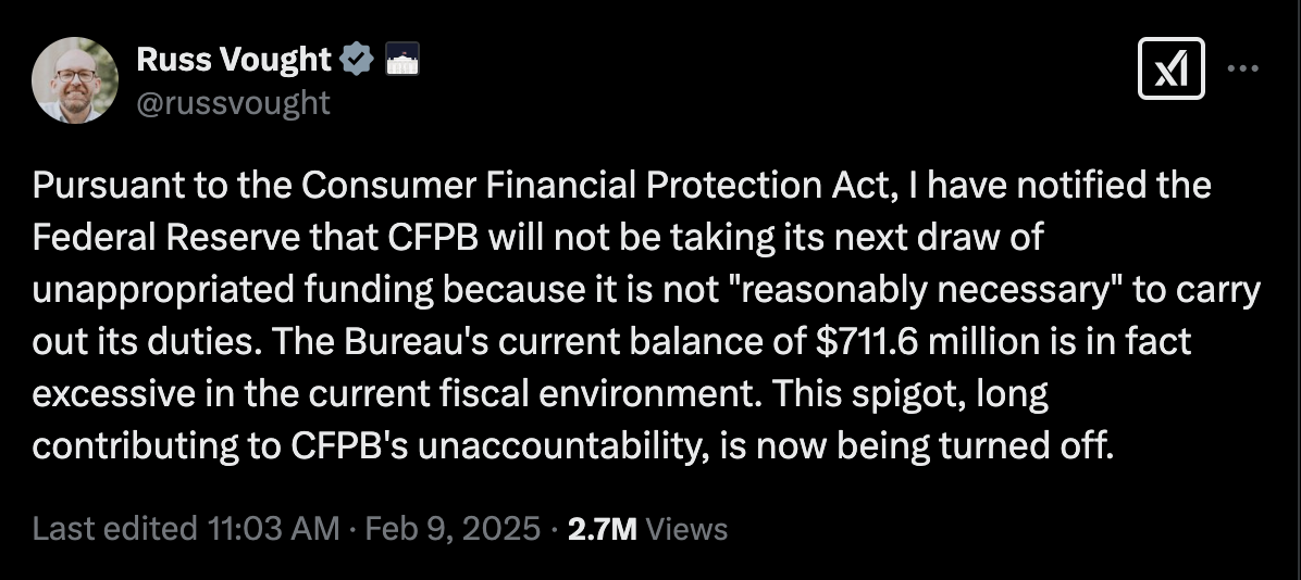 The U.S. Consumer Financial Protection Bureau (CFPB) has recently undergone major changes, with Acting Director Russ Vought ordering a halt to regulatory and enforcement actions, and refusing to apply for funding from the Federal Reserve (Fed), effectively weakening the CFPB's operational capacity, sparking widespread discussion. The CEOs of well-known crypto exchanges Coinbase and Gemini have expressed approval, and even Elon Musk has voiced his support.