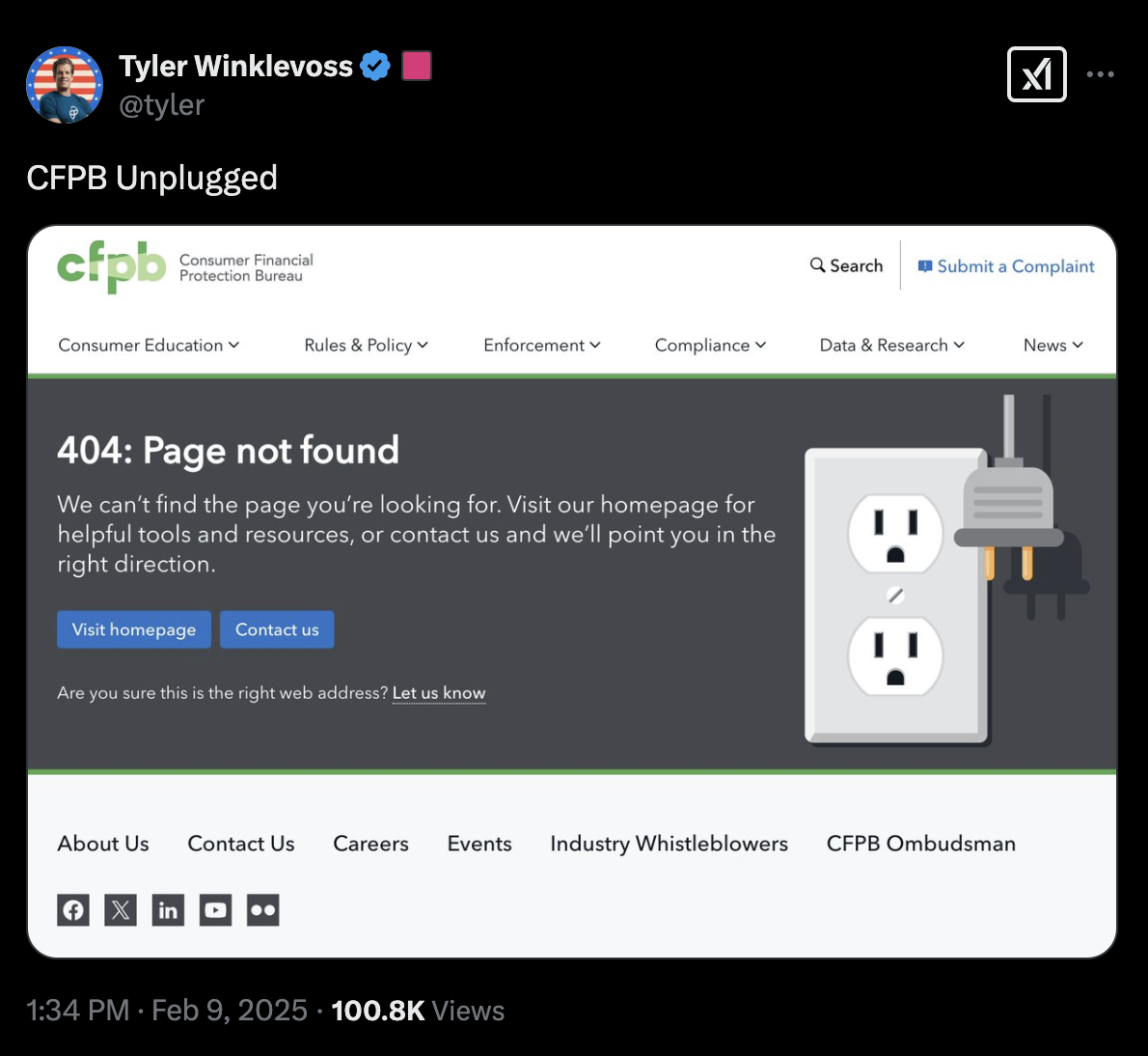 Vought's actions have also received support from the crypto community and Elon Musk. Gemini CEO Tyler Winklevoss tweeted a screenshot of the CFPB website's "404 error page", captioning it "CFPB Unplugged", implying that the CFPB's powers are about to be removed.