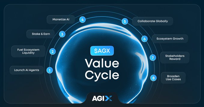 The $AGX Value Cycle: Driving the AI Ecosystem 🚀 1️⃣ Launch AI Agents $AGX is the cornerstone for deploying AI agents, simplifying creation and powering innovation across industries. 2️⃣ Fuel Ecosystem Liquidity All AI agent tokens are paired with $AGX in liquidity pools,