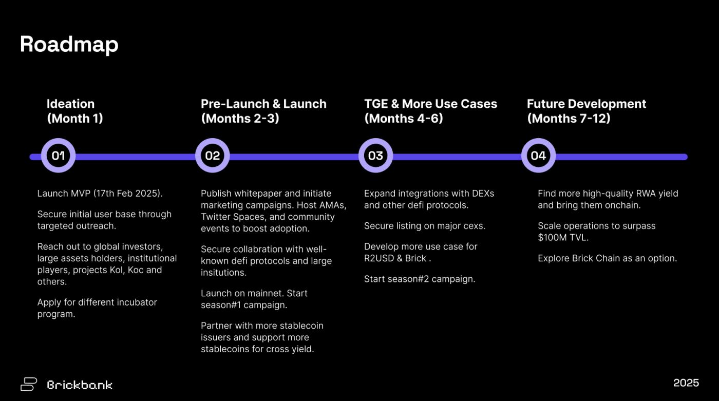 • Cross-chain Expansion: BrickBank will initially launch on the Ethereum mainnet to ensure early-stage security, stability, and liquidity. After reaching a certain scale, we plan to expand to Solana and other L1/L2 solutions to enhance scalability and user experience, driving widespread adoption.