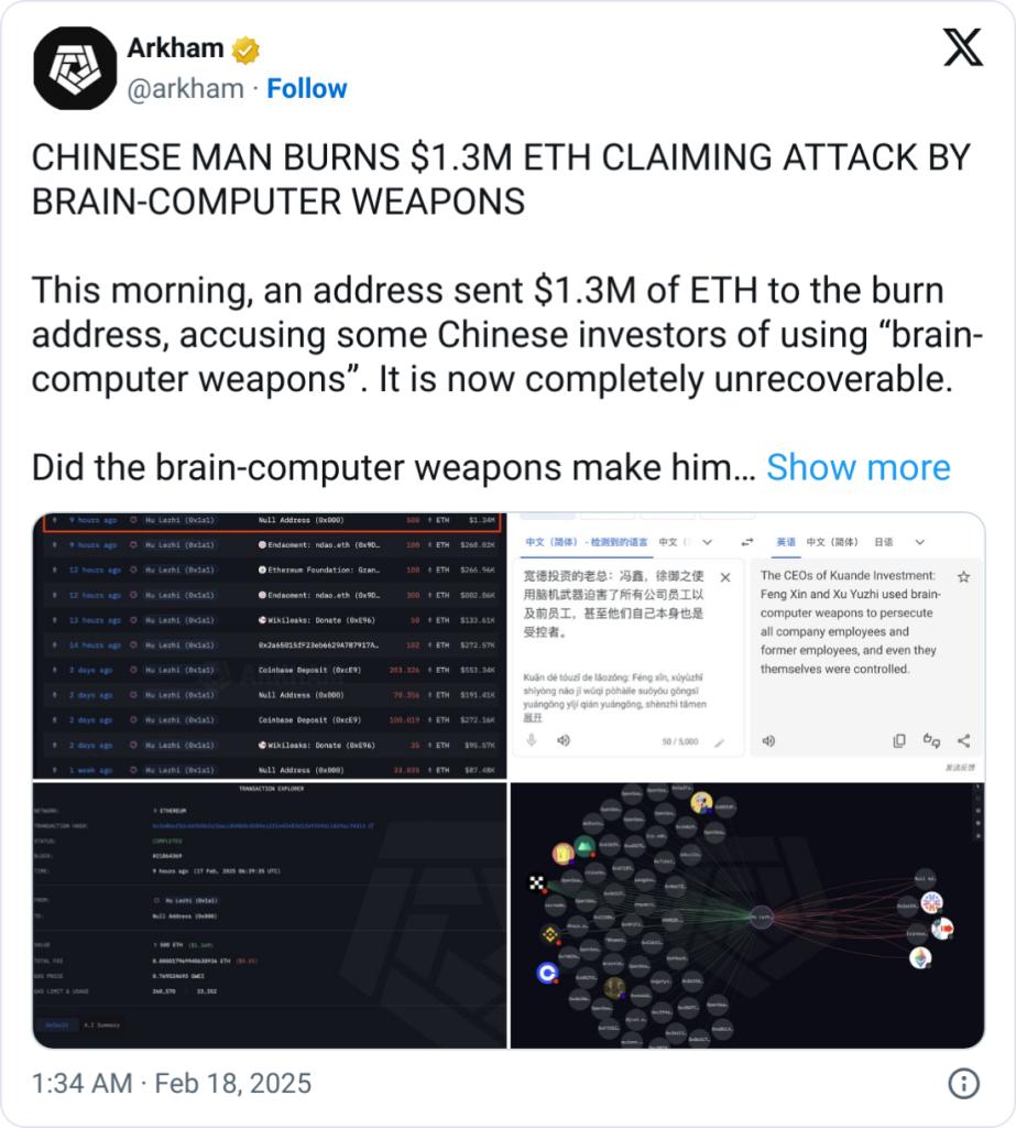 The story began when Hu Lezhi, an Ethereum investor, made a transaction to transfer 500 ETH to a null address on February 17 - an unusual move detected by the analytics platform Arkham. More notably, Lezhi's previous transaction history included 16 transfers of ETH to various addresses, including WikiLeaks, the Ethereum Foundation, burn addresses, and some unidentified wallets. In total, he had transferred 2,553.25 ETH, equivalent to around 6.86 million USD as of February 18.