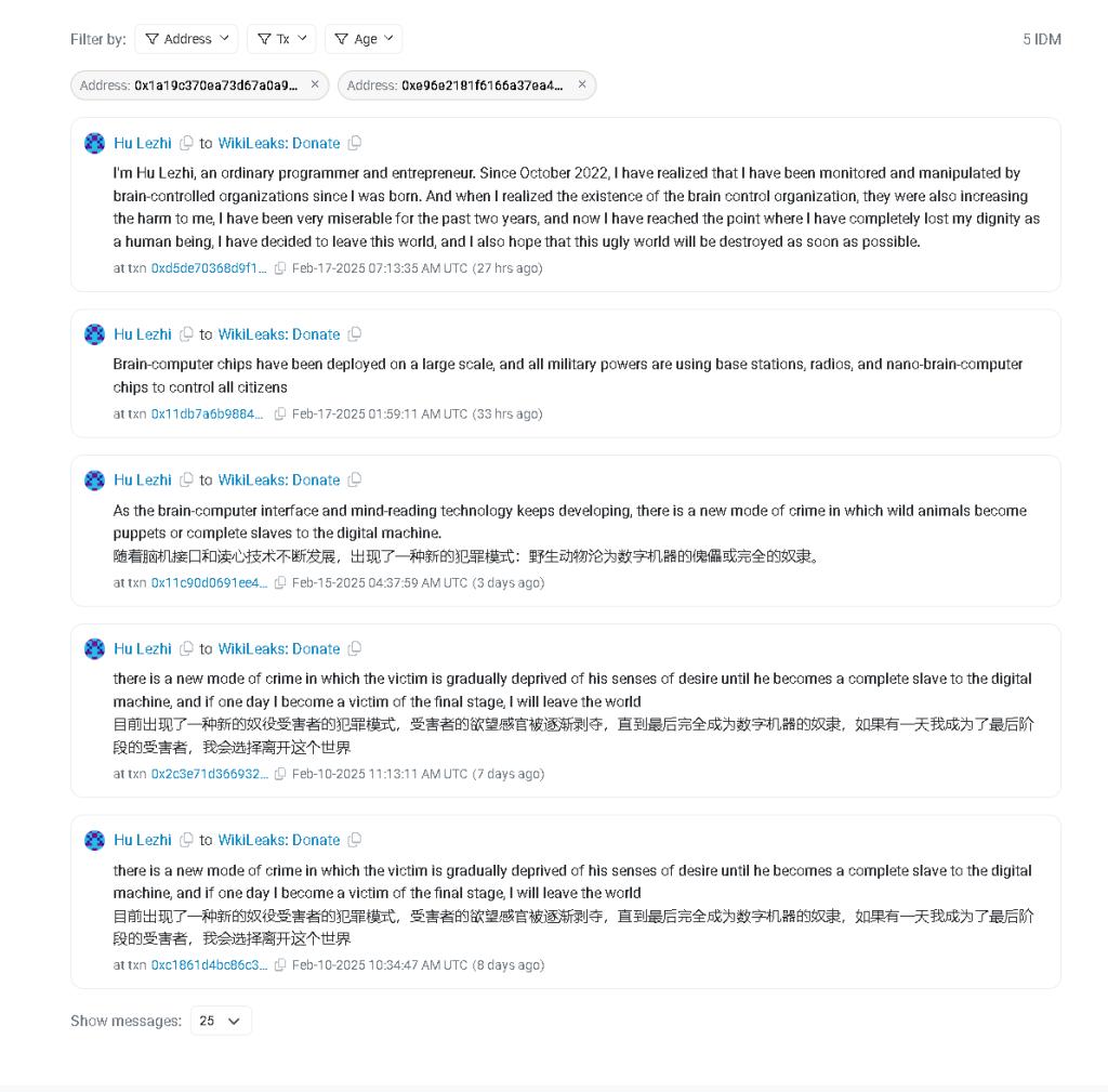 The distinctive feature of this series of transactions is the accompanying on-chain messages. Lezhi, who identifies himself as a programmer, accuses Chinese businesses and organizations in China of using brain-computer weapons to control employees, turning them into puppets or completely dependent on the digital system. He claims that he has been under surveillance and manipulation throughout his life, and describes the increasing pressure he has felt as he has become aware of this.
