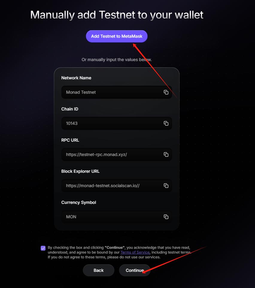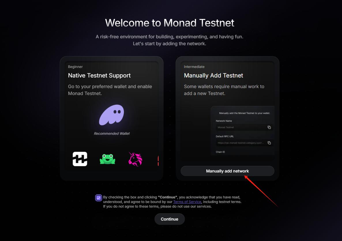 STEP 1. Add Testnet (Link: https://testnet.monad.xyz/): After entering the link, click "Manually add network", click "Add Testnet to MetaMask", and then click "Continue".