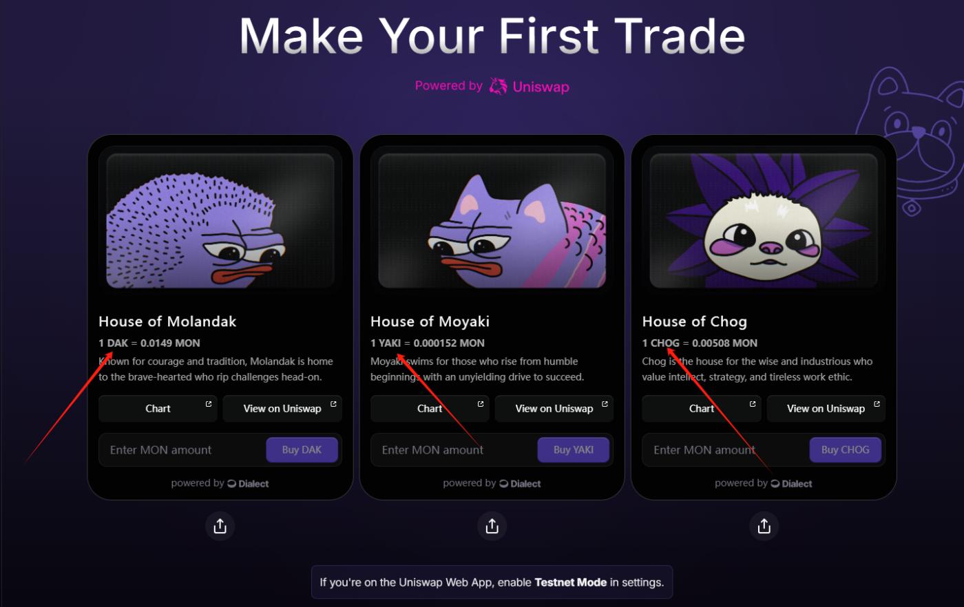 STEP 3. Continue down the page and complete the first transaction on the testnet: Enter the amount of tokens you want to buy in the three corresponding input boxes, and buy DAK, YAKI, and CHOG.