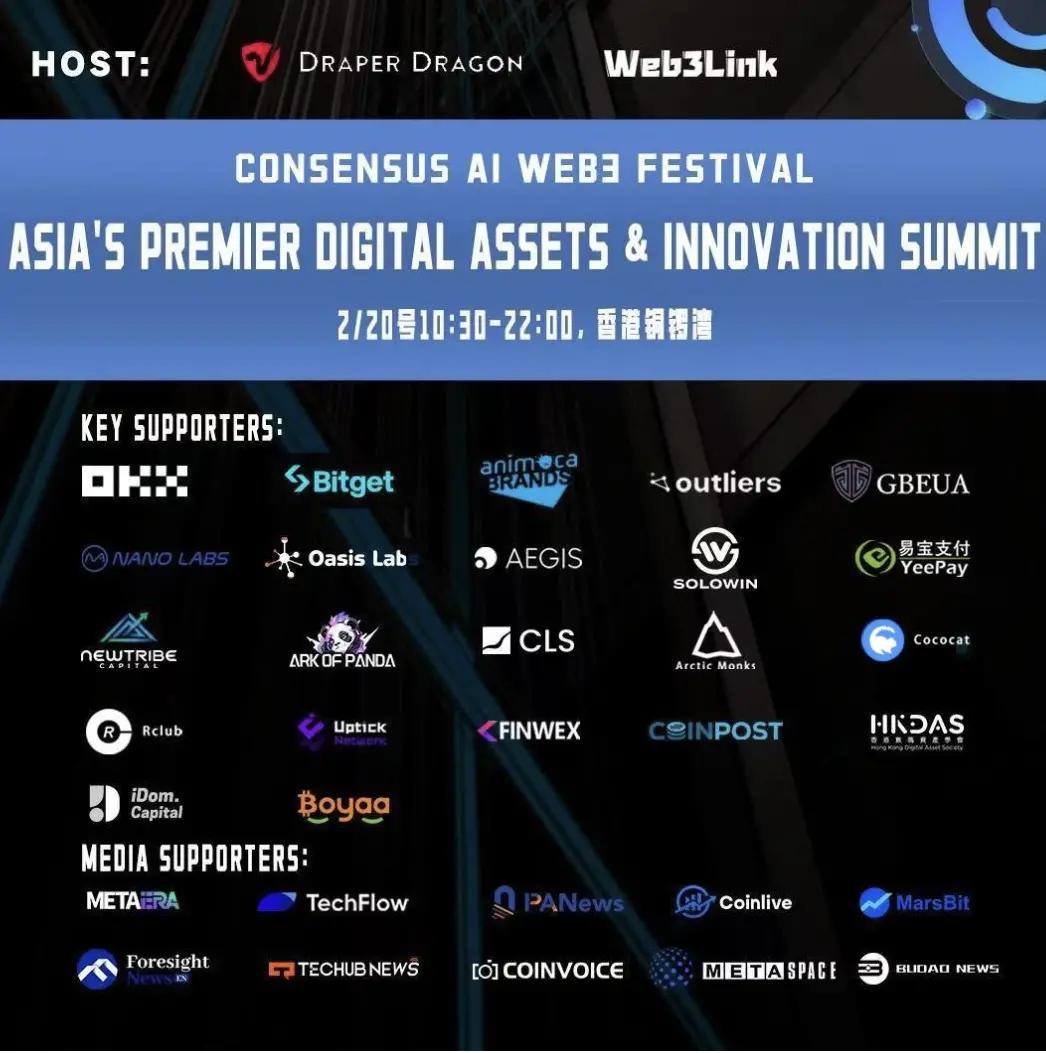 The Hong Kong Consensus AI Web3 Summit will be held on February 20, 2025, which is the leading digital asset and innovation summit in Asia. This event is jointly organized by Draper Dragon, Web3link, ICP China, TradingBase, GBEUA and other institutions.
