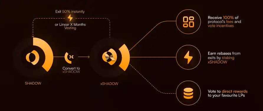 The $SHADOW token is the most primitive token, which can be freely exchanged with other currencies. $SHADOW can be exchanged 1:1 for the xSHADOW token, which is the core of the entire model. xSHADOW stakers can vote to directly allocate rewards to LP pairs, and by staking, they can also receive 100% of the protocol fees, voting rewards, and exit penalties.