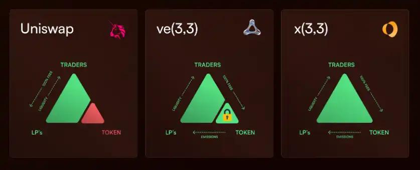 Uniswap focuses on a simple two-party system: traders and liquidity providers (LPs). ve(3,3) improves on this by appropriately adjusting the incentive measures and the rights of token holders, but obtaining these incentives is unfair and heavily biased towards the protocol.